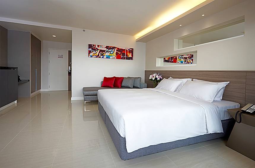Deluxe Double is 377 square feet and includes a king-size bed 150-183 width.